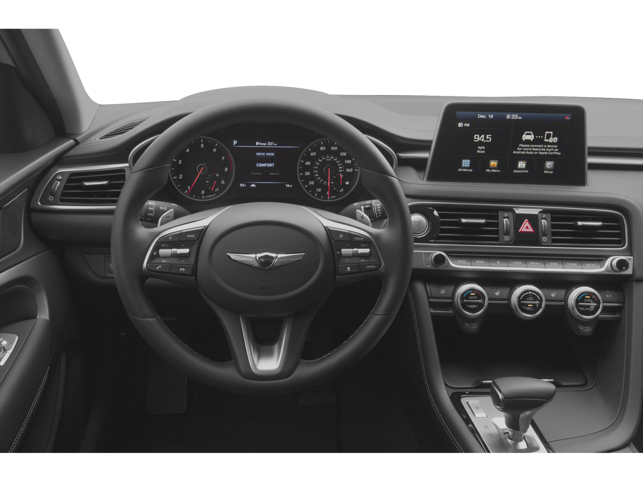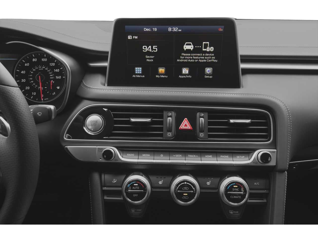 - Radio: AM/FM/SiriusXM/HD Audio System -inc: 6 channel internal amplifier, 6 speakers including subwoofer, 8" touchscreen display, front 12V power outlet, steering wheel controls, Android Auto, Apple CarPlay, 2 front USB ports, auxiliary input jack, Bluetooth® hands-free phone system and Genesis Connected Services